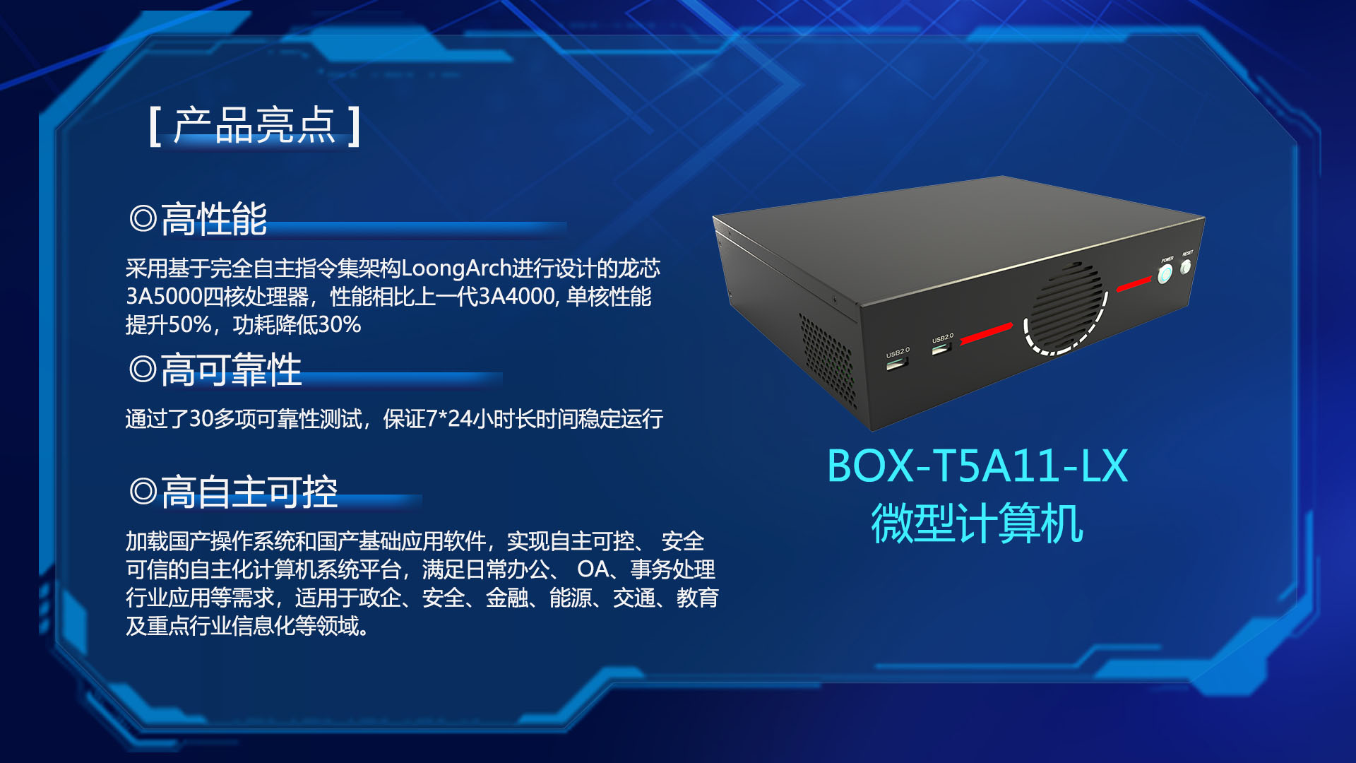 研恒(特控)BOX-T5A11-LX微型計(jì)算機(jī)采用基于完全自主指令集架構(gòu)LoongArch進(jìn)行設(shè)計(jì)的龍芯3A5000四核處理器,性能相比上一代3A4000, 單核性能提升50%,功耗降低30%,指令集系統(tǒng)架構(gòu)承載的軟件生態(tài)走向完全自主。整機(jī)采用純工業(yè)設(shè)計(jì),通過了30多項(xiàng)可靠性測(cè)試,保證設(shè)備7*24小時(shí)長(zhǎng)時(shí)間穩(wěn)定運(yùn)行。配套國(guó)產(chǎn)BIOS,加載國(guó)產(chǎn)操作系統(tǒng)和國(guó)產(chǎn)基礎(chǔ)應(yīng)用軟件,實(shí)現(xiàn)自主可控、 安全可信的自主化計(jì)算機(jī)系統(tǒng)平臺(tái),滿足日常辦公、 OA、事務(wù)處理,行業(yè)應(yīng)用等需求,適用于政企、安全、金融、能源、交通、教育及重點(diǎn)行業(yè)信息化等領(lǐng)域。