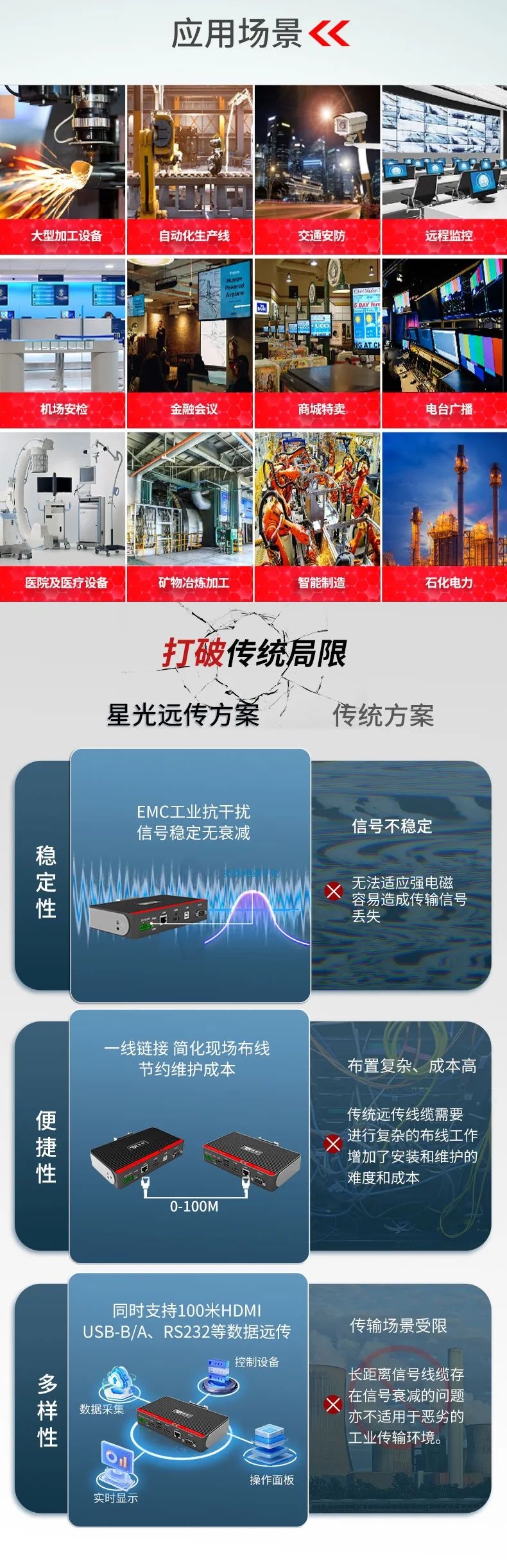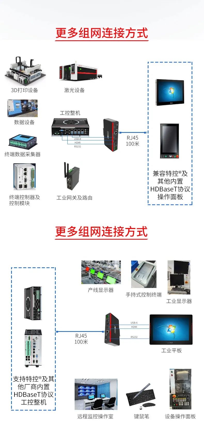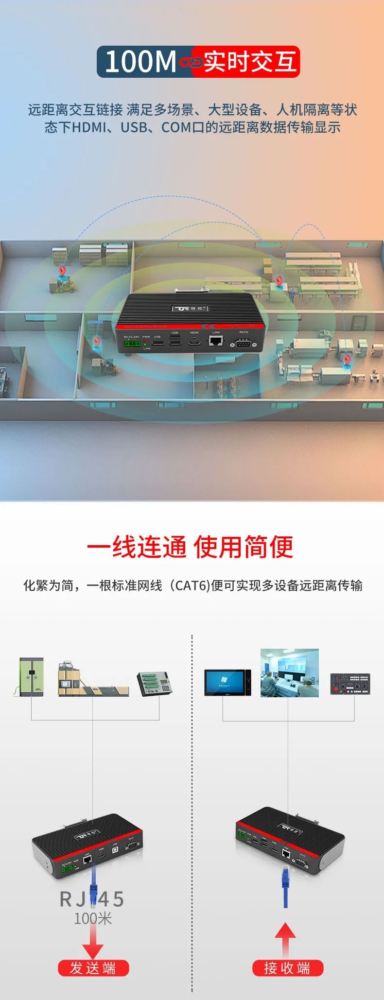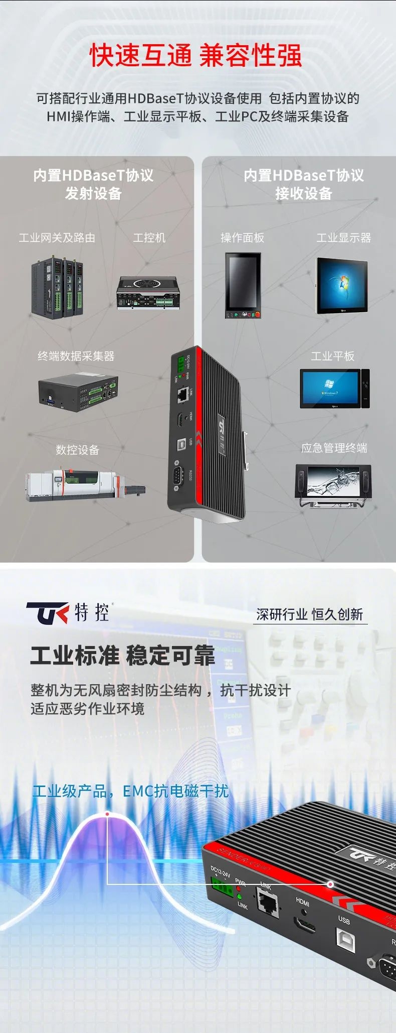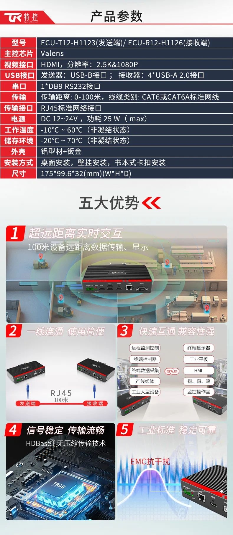 在大型裝備、自動化產(chǎn)線、激光及數(shù)控行業(yè)等需要遠(yuǎn)距離信號傳輸場景中,傳統(tǒng)HDMI線纜存在信號衰減、傳輸距離限制、布線不便等問題,這極大地影響顯示端的成像質(zhì)量和雙向數(shù)據(jù)的穩(wěn)定性和時(shí)效性。為此,特控研發(fā)出抗干擾性強(qiáng)、數(shù)據(jù)零延時(shí)、兼容性強(qiáng)的HDMI星光遠(yuǎn)傳ECU-TR12。特控ECU-TR12采用進(jìn)口高性能芯片設(shè)計(jì),總體由發(fā)射端T12和接收端R12兩部分組成,發(fā)射端可將2.5k高清視頻信號、USB和RS232數(shù)據(jù)信號進(jìn)行整合,通過標(biāo)準(zhǔn)網(wǎng)線(CAT6)遠(yuǎn)距離傳輸?shù)浇邮斩耍瑹o信號衰減,接收端通過高性能智能芯片解碼,可以給用戶高速高質(zhì)量的數(shù)據(jù)及顯示交互體驗(yàn),整機(jī)外殼采用鋁合金散熱設(shè)計(jì),機(jī)身堅(jiān)固小巧獨(dú)具工業(yè)美感,可搭配行業(yè)通用HDBeasT協(xié)議設(shè)備使用,包括內(nèi)置協(xié)議的HMI操作端、工業(yè)顯示平板、工業(yè)PC及終端采集設(shè)備。