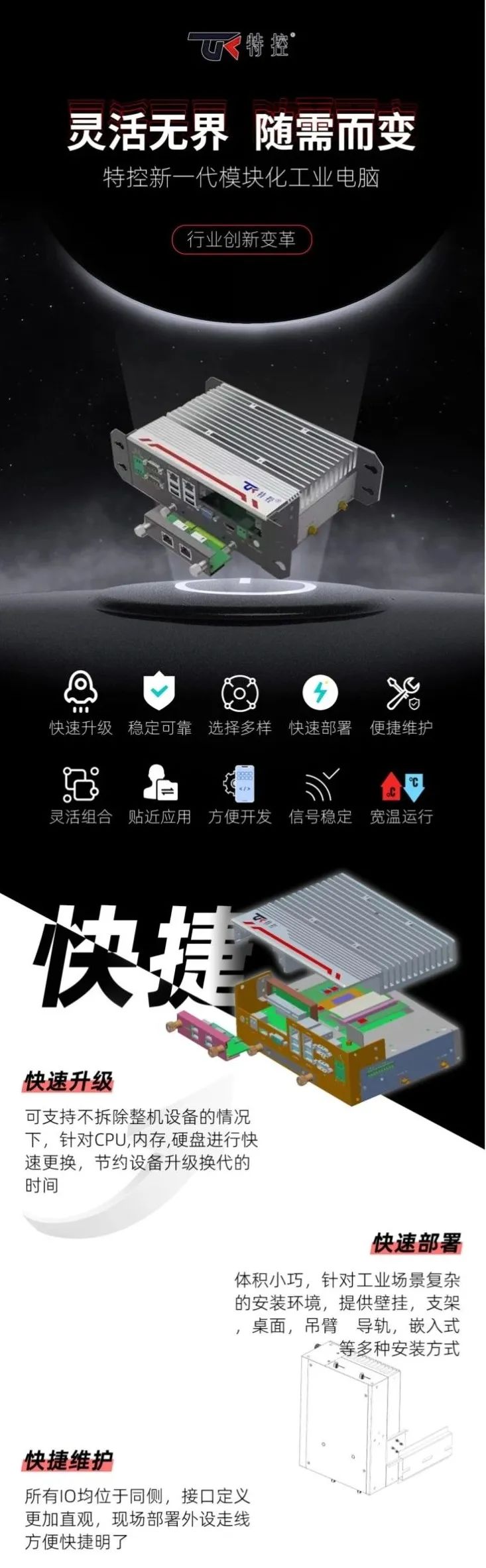 靈活無界,隨需而變,特控新一代模塊化工業(yè)電腦,行業(yè)創(chuàng)新變革??焖偕?jí)、穩(wěn)定可靠、選擇多樣、快速部署、便捷維護(hù)、靈活組合、貼近應(yīng)用、方便開發(fā)、信號(hào)穩(wěn)定、寬溫運(yùn)行。